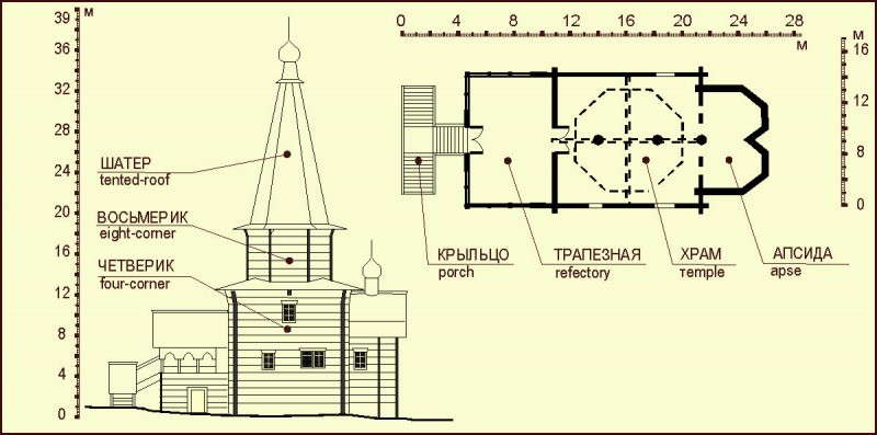 Памятник представляет собой традиционную для культовых деревянных построек XVIII века трехчастную композицию плана с развитием вдоль продольной оси. Церковь одноэтажная на высоком подклете (3,6 м). Храм типа восьмерик на четверике с шатровым завершением (размеры храма в плане: 9,9 х 9,9 м). Высота четверика составляет 10,7 м, восьмерика – 5,5 м, шатра – 15,3 м, главы с крестом – 6,6 м. К восточной стене храма пристроена двухчастная апсида (в плане 4,9 х 8,5 м, высота сруба – 6,8 м), крытая «бочкой»; к западной стене – трапезная (паперть). К западной стене паперти пристроено большое по объему двухвсходное крыльцо под рундучной кровлей, богато декорированное элементами ограждающих конструкций и декора кровли, что дополняет лаконичное декоративное оформление фасадов церкви.