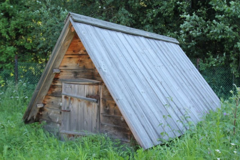 Ледник данного типа – копаная яма, укрепленная досками и напогребница типа двускатного шалаша. Аналогом для проектирования послужил ледник в усадьбе Е.С. Чирковой (д. Соколово, Маныловского сельсовета Тотемского района), обследованный в 1979 году.Конструктивной основой напогребницы служат толстые колья жердей, наклонно вбиваемые в землю; по верху и по скатам колья связаны слегами, по которым устраивается покрытие кровли из двух слове теса. Коек прикрывается дощатым нащельником. Тес доходит до земли; пазухи по бокам прикрываются досками; для входа служит простая щитовая дверь.