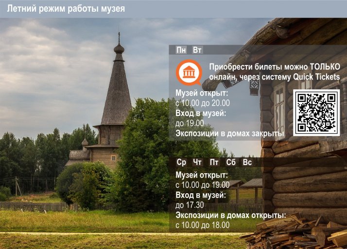 У вас появляется дополнительная возможность отдохнуть на лоне природы в понедельник и вторник, вдали от суеты и шума, разглядеть деревянные памятники в мягком вечернем свете и, конечно, оставить яркие фотографии на память о летней прогулке. К вашим услугам аудиогиды, высокие деревянные качели, карусель «гигантские шаги». Кому-то доставит удовольствие общение с лошадкой, гуляющей на просторах музея, а кто-то решит подремать под аккомпанемент звуков природы в свежескошенной траве. Вариант отдыха в музее подойдёт для романтических встреч и красивых признаний, для организации пленэра под открытым небом и просто как средство эмоциональной разгрузки после трудового дня.