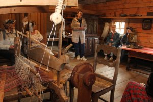 В рамках него прошла экскурсия по экспозиции "Основные занятия крестьян", которая познакомила слушателей Школы с полным циклом льнообработки: от посева и сбора льна до получения льняной кудели, затем нити, и заканчивая процессом производства домотканины.