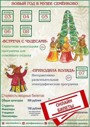 Приближается время волшебства и сказки. Мы стараемся сделать праздники особенными и запоминающимися. Ежегодно музей в новогоднюю пору посещает несколько тысяч человек. Если вы не хотите терять драгоценное время, простаивая в очередях за входными билетами мероприятия "Встреча с чудесами" или "Приходила коляда", то предлагаем вам воспользоваться возможностью приобретения билетов онлайн!