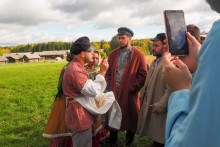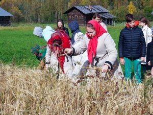 Отправившись гулять по деревне, гости музея присоединились к местной молодёжи, которая собралась на жатву. "Зерно в колосе - торопись сжать полосу". Ловко посетители музея за "деревенскими" поспевали, орудовали серпами. Снопы вязали, последнюю полосу дожинали.