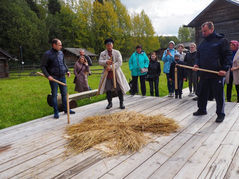 Попробовав свои силы в жатве, не отказались гости и обмолоту зерна поучиться. Взяв в руки молотила, с особым рвением по колосьям ударяли, зерно провеивали, собирали.