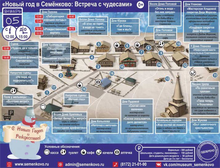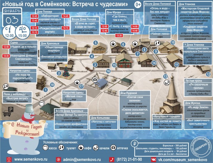 Музей "Семёнково" предлагает отправиться в необычное путешествие на встречу с Новым годом. Подчищайте то, что не успели сделать в текущем 2018 году и занимайте самые лучшие места. Где? Сперва у окошек собственных квартир и домов, чтобы не пропустить позывные зимы. Как только стёкла затянутся морозным узором, а снежинки напрочь вскружат вам голову, бегом в новый год! На лыжах или санках, собачьих упряжках или лошадях, главное, важно оказаться в нужном месте и в правильный час! Там, где концентрация смеха, улыбок, детского восторга и счастья зашкаливает! С 3 по 6 и 8 января сказочная "Кладовая секретов Деда Мороза", известная среди вологжан и не только их, как музей "Семёнково", обещает долгожданную встречу с чудесами!