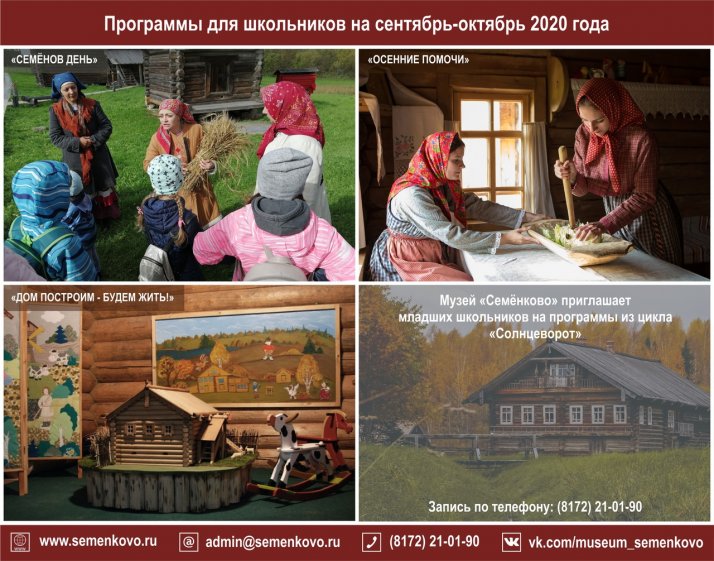 Приезжайте в музей «Семёнково» на «Осенние помочи»! В рамках программы дети познакомятся с традицией помочей на Русском Севере, узнают о видах коллективных работ, «примерят» на себя роль деревенского жителя-помочанина, примут участие в рубке и засолке капусты, колке дров, укладывании поленницы, угостятся деревенским лакомством.