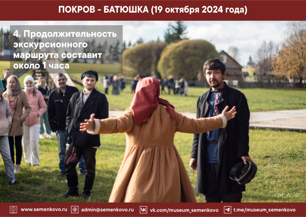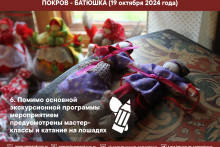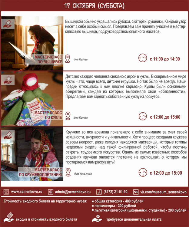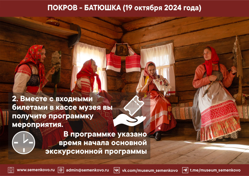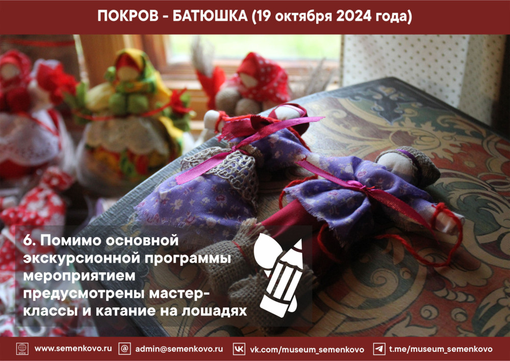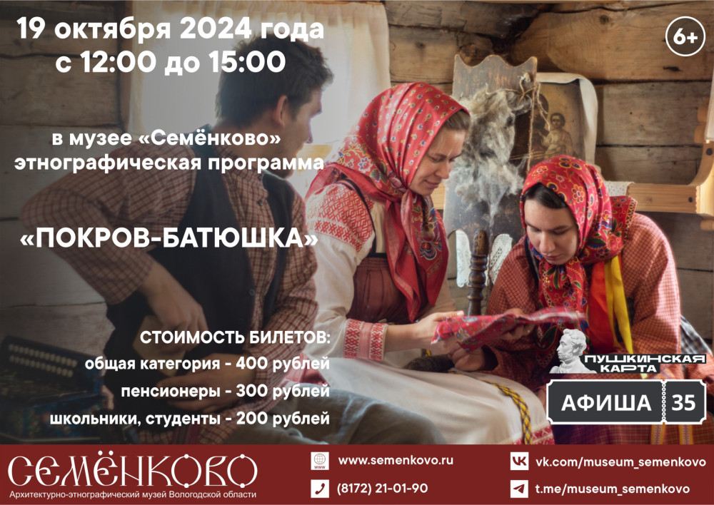 Приезжайте к нам на Покров! В программе мероприятия: два экскурсионных маршрута (начало в 12:00 и 14:00 часов), рекомендованных для взрослой аудитории и посетителей с детьми: посиделки и сватовство, приезд женихов и народные игры, вологодские сказки; мастер-классы по вышивке и кружевоплетению, изготовлению куклы-десятиручки; катание на лошадях и другое. В музейном кафе «Молочная лавка» - горячие блины и ароматный чай!