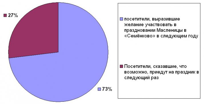 Нас очень порадовал и воодушевил тот факт, что большинство гостей (73%) выразило желание участвовать в праздновании Масленицы в «Семёнково». И четверть опрошенных ответили, что, возможно, приедут на праздник в следующем году. Отказов от дальнейшего участия в мероприятии не было.