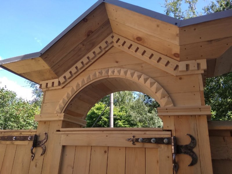 Теперь сложно пройти мимо этой красоты, не задержав взор на добротно выполненной работе. Массив из свежего дерева выглядит эффектно и самобытно благодаря использованным декоративным приёмам: искусно сделанной обшивке, деликатной резьбе по дереву, сохранённым кованным петлям и ручкам в виде колец. Украшением входа являются и причудливые арки с двух сторон от центральных распашных ворот, опирающиеся на деревянные колонны. Свежее, благородно-золотистое дерево в лучах солнца выглядит сейчас удивительно парадно и празднично. И мы не удивимся, если в скором будущем найдутся желающие из числа гостей нашего города, да и вологжан, кто захочет запечатлеть объект и сфотографироваться на фоне этой красоты.