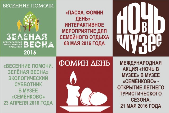 Музей «Семёнково» приглашает Вас принять участие в мероприятиях, которые пройдут в апреле – мае 2016 года. Планируйте отдых в музее, ведь это познавательно, увлекательно и интересно!