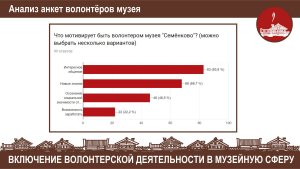 Как выжить музею в современных условиях без поддержки добровольцев? Это не праздный вопрос, а реальность, в которой живёт музей «Семёнково» уже более 10 лет. Круг людей, помогающих музею, чрезвычайно широк, и музей дорожит этой дружбой и принимает её в разной форме. Волонтёры – это те, кто ежегодно приезжают на акцию «Весенние помочи»; те, кто наполняют музей жизнью; те, кто по первой просьбе откликаются и фотографируют музейные праздники и будни и т.д.