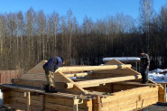 Сперва казалось, что сруб будет набирать высоту венцами, но нет. Выше третьего венца начинают уже вырисовываться фронтоны, на них уложены слеги – основание будущей крыши.