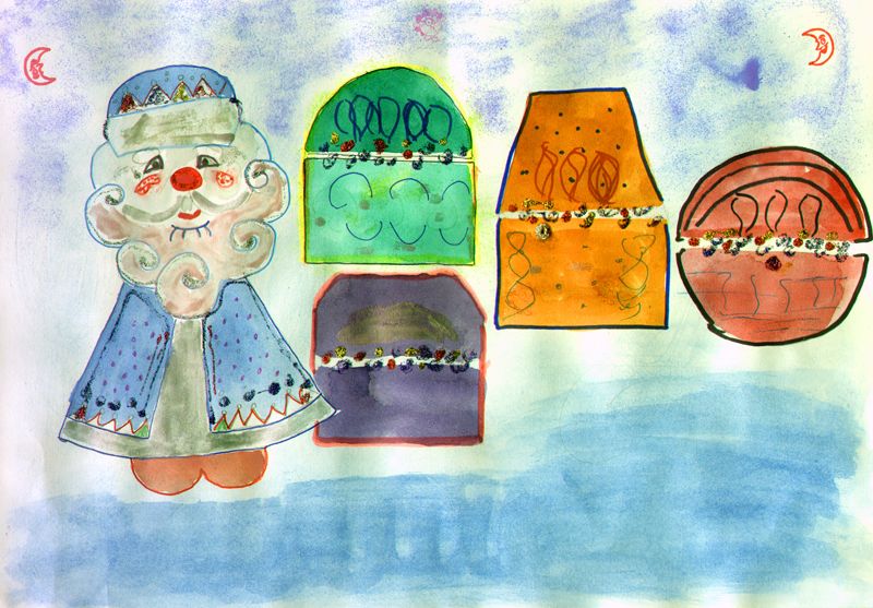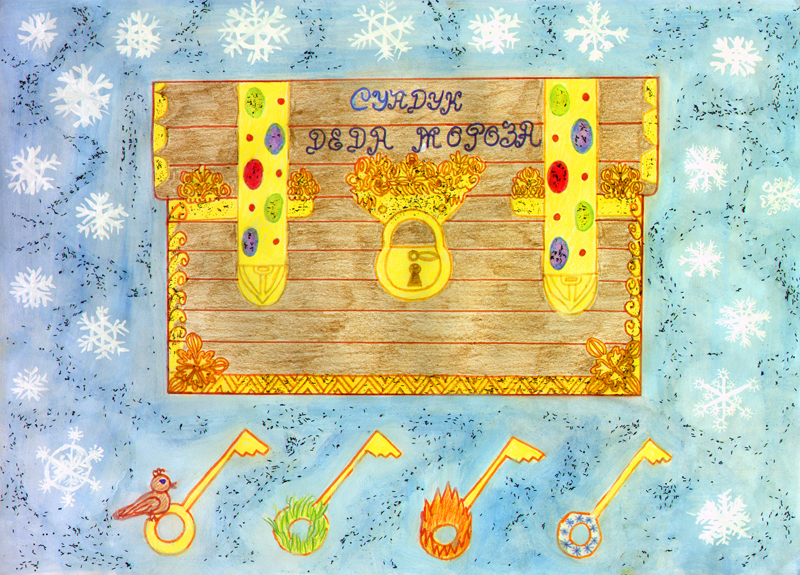 Видит Мороз: пришло время недоброе, время тревожное. Надобно от беды, куда подальше, заклинания спрятать. Приказал он тогда мастерам своим четыре сундука изготовить… Непростых сундука… А таких: что по одному велению его, через заклинание волшебное, вмиг невидимыми становиться могли бы. «В первом сундуке, - сказал Дед Мороз, - пускай огонь горит, во втором же – урожай зреет. В третьем – пусть вода журчит, переливается, ну, а в четвертом – ветра веют, один другому наперебой вторят». Исполнили мастера наказ Деда Мороза. Вот, уж, сундуки стоят готовы. Стоило ему одно слово волшебное молвить, да посохом своим оземь ударить, как стихии послушными, кроткими стали. Тут же воле его покорились и в сундуках до поры до времени схоронились… Да, как видно, не рассчитал Дед Мороз силы заклинания своего… Глянул, а на сундуках тех замки причудливые растут. «Вот так диво - дивное, чудо - чудное! – думает, да одна беда: где ж ключи взять такие, чтоб запоры затейливые открывали?»