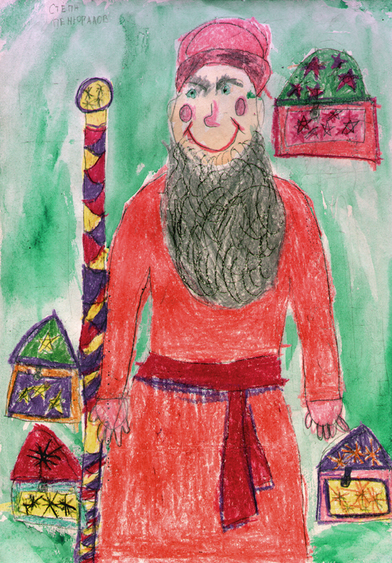 Только успели перевести дыхание, смотрят, а впереди, сверкая красками, стоит высокий терем. Вошли в него, огляделись по сторонам и видят: сидит на лавочке, горько вздыхая, Дед Мороз. «Откуда будете, люди добрые, куда путь держите?», - спрашивает он. А Кузьма ему в ответ, с поклоном, и говорит: «Издалека. Сами-то мы Семенковские: я – Кузьма – кузнец, брат мой, Демьян – гончар, Марьюшка – певунья да Авдотьюшка – кружевница. Вот прослышали мы, Дед Мороз, про печаль твою, да про то, как силы темные завладеть задумали стихиями, перепутали зиму лютую с летом красным... И до наших мест беда докатилась: рожь не взошла, пшеница не уродилась. От каликов перехожих узнали, будто есть у тебя сундуки с замками чудными, с замками диковинными. Сказывали они, что секрет замков тех до сих пор никому неведом. Вот прими в дар от нас, от чистого сердца, ключи, авось, и получится запоры волшебные открыть.